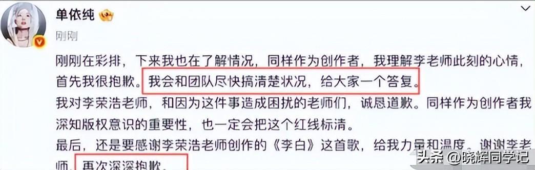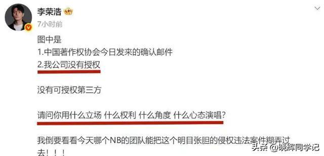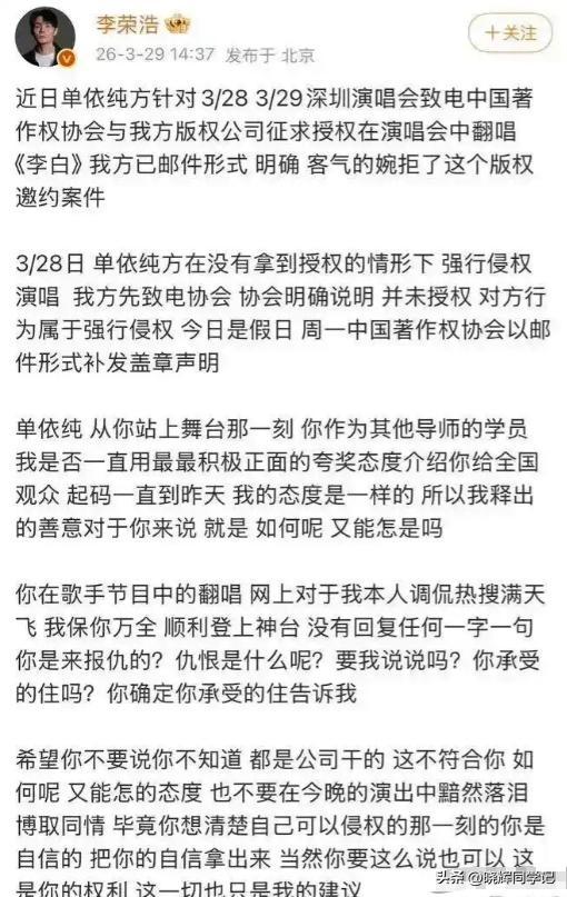 李荣浩直接公开喊话质问单依纯的侵权行为。