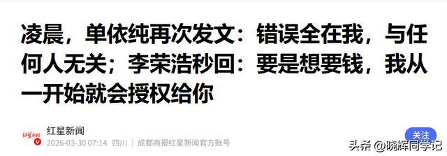 红星新闻(凌晨,单依纯再次发文:错误全在我,与任何人无关;李荣浩秒回:要是想要钱,我从一开始就会授权给你 2026.03.30)
