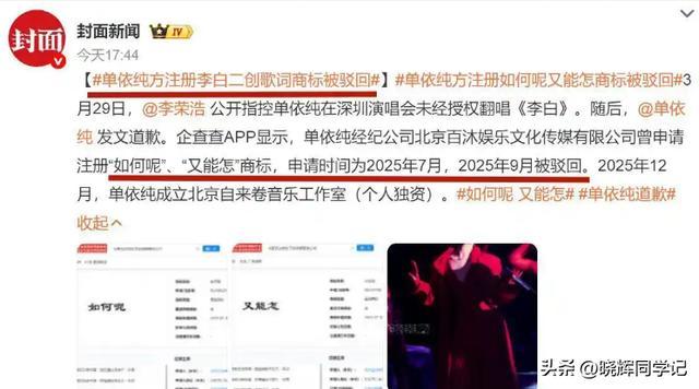 直指新生代歌手单依纯在演唱会上未经授权演唱了他的代表作《李白》。
